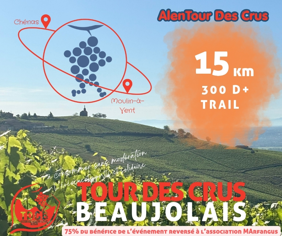 Un parcours accessible qui permet de découvrir l’esprit du Tour Des Crus Beaujolais. Au fil des kilomètres, vous sillonnerez les vignobles de Chénas et Moulin-à-Vent, deux crus emblématiques de notre territoire. Un tracé convivial, parfait pour s’initier au trail ou profiter d’un beau moment sportif dans les vignes.